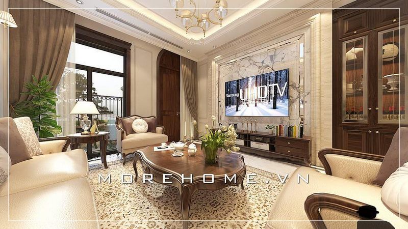 Đá ốp phòng khách đẹp kết hợp phong cách tân cổ điển trong đồ nội thất gỗ óc chó đã tạo nên vẻ đẹp độc đáo, sang trọng đặc biệt biệt thự, nhà phố.